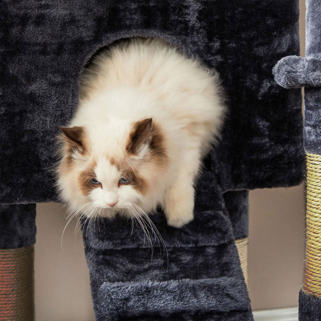 • Plusieurs poteaux griffoirs et jouets suspendus pour stimuler l’activité et l’instinct de chasseur.